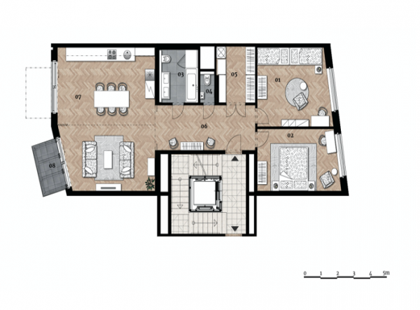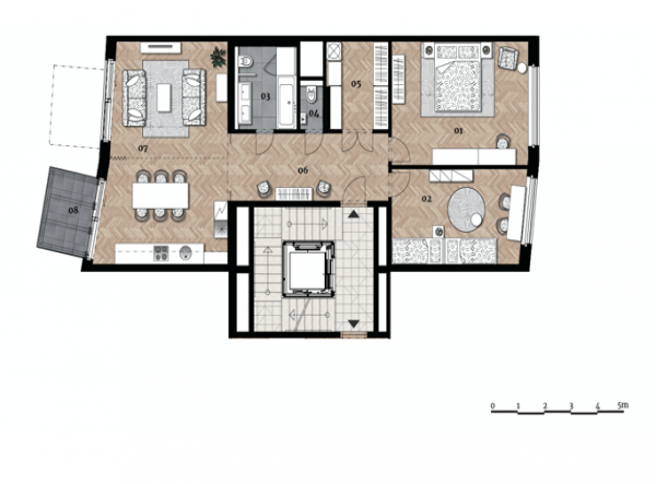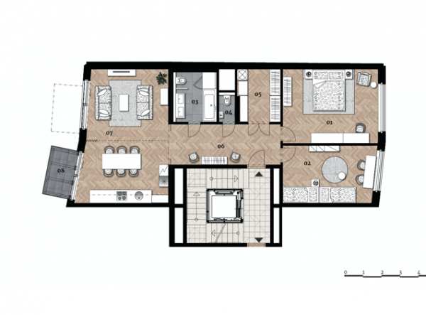 В апартаментах «Самова» предлагается 26 эксклюзивных квартир с планировкой 2+кк и 4+кк и два коммерческих помещения. Центр каждой квартиры – это просторный холл, соединенный со всеми остальными комнатами. У квартир на уровне первого этажа есть собственные сады, у квартир на верхних этажах – балконы, на седьмом этаже находятся лоджии, выходящие на южную и северную сторону. У каждой квартиры также есть своя кладовка и машиноместо в подземном гараже.