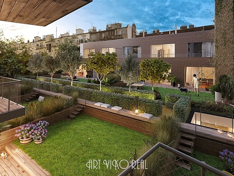 Посередине дом разделен продолговатой галереей, а во внутреннем дворе находится небольшой парк для резидентов и двухэтажная постройка с двумя квартирами мансардного типа. Цена по запросу