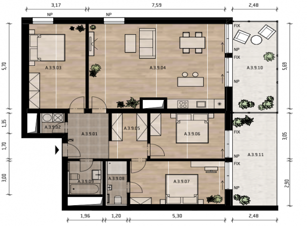 Представлены все планировки от 1+kk до просторных пентхаусов, которые расположены на самых верхних этажах и предлагают вид на Пражский Град с просторной террасы. В одном из домов пентхаус занимает даже весь этаж и лифт идет прямо в квартиру. Мы также спроектировали несколько выбранных квартир исключительно с зимним садом. На первом этаже расположены коммерческие помещения, которые дополнят и без того богатую инфраструктуру дополнительными магазинами и услугами. В подвале будет парковка с большим количеством парковочных мест, а также технические помещения (кладовки).